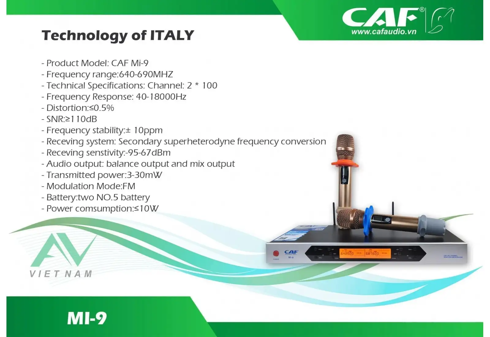 Micro CAF Mi-9 dòng micro cao cấp chuyên dùng cho ca sĩ chuyên nghiệp, sản phẩm chính hãng CAF nhập khẩu phân phối bởi công ty AV Việt Nam được sử dụng trong các dự án âm thanh chuyên nghiệp.