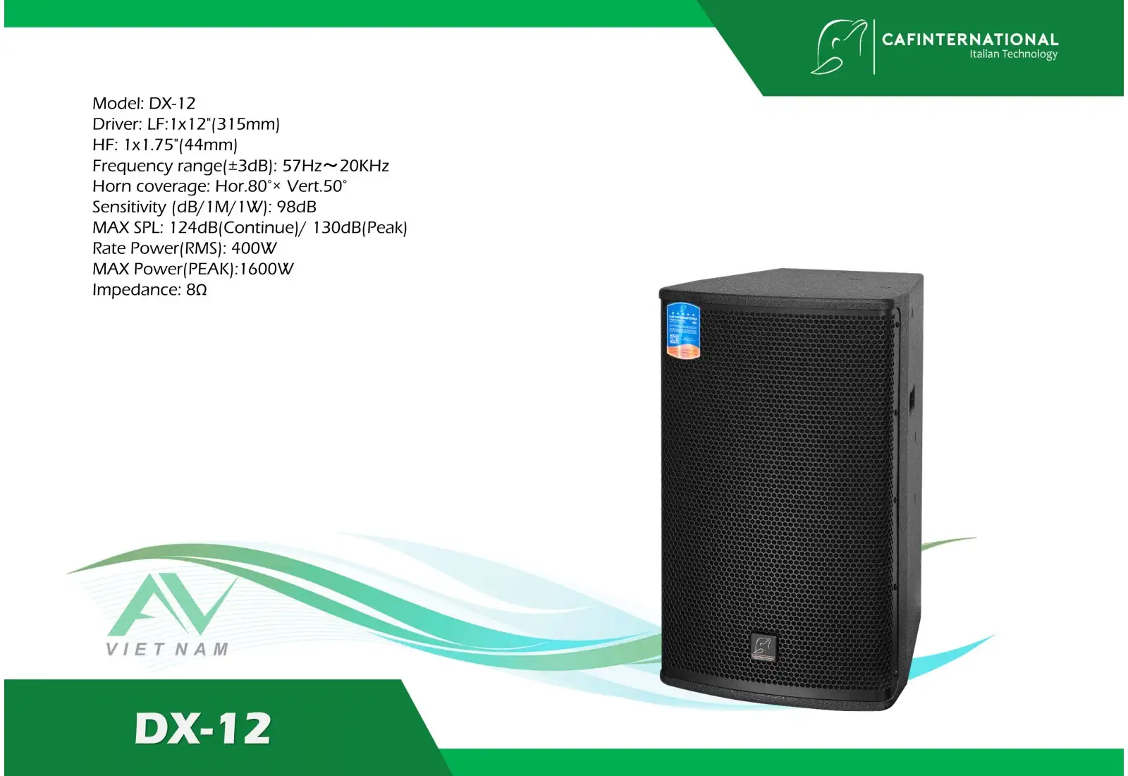 Loa được trang bị củ loa bass 12 inch (315mm) cho dải trầm uy lực và driver treble 1.75 inch (44mm) mang lại âm cao sáng, chi tiết. Nhờ đó, DX-12 tái tạo âm thanh đầy đủ, cân bằng và chân thực, cho giọng hát trở nên mượt mà, bay bổng.