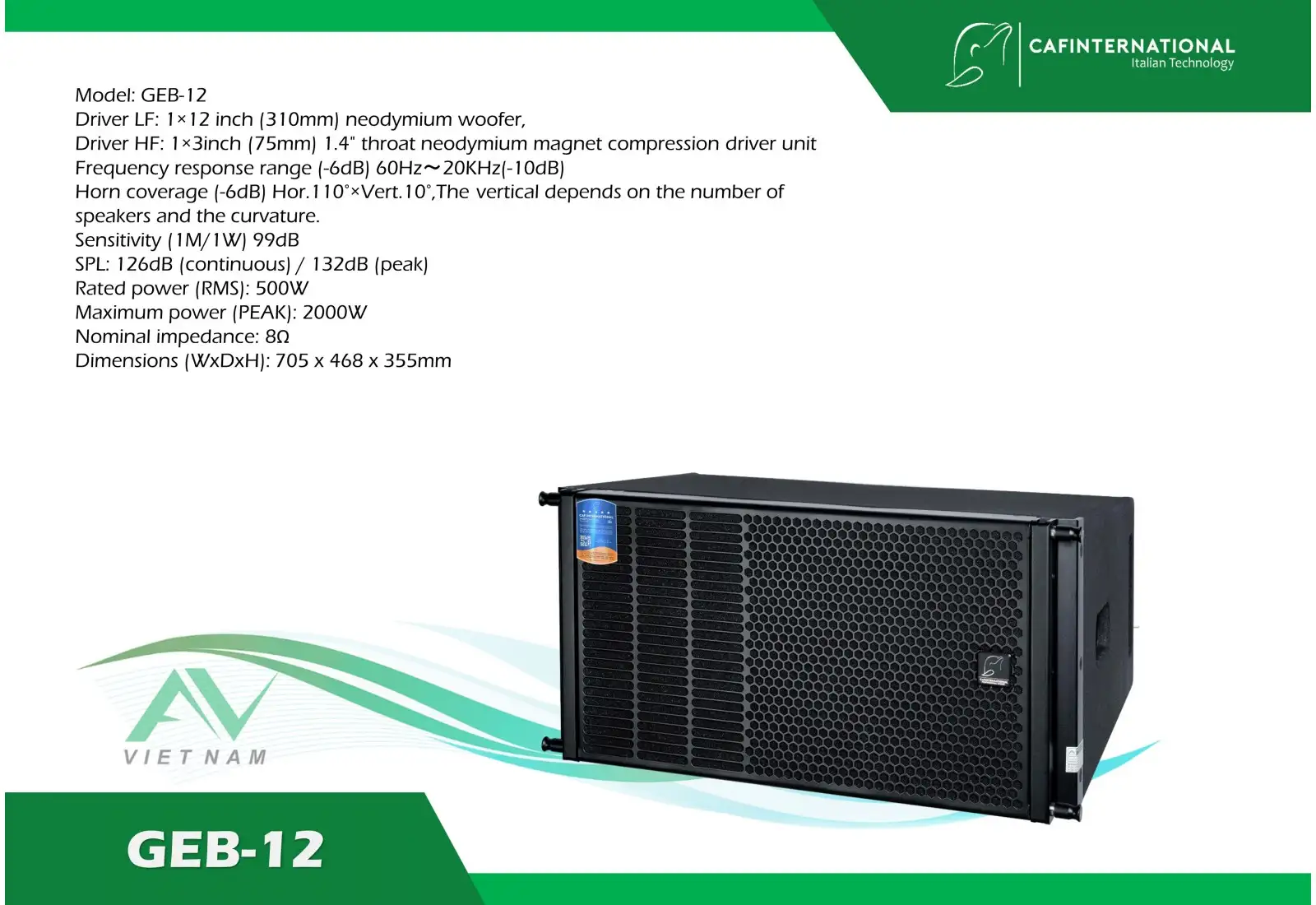 Bạn đang tìm kiếm một hệ thống loa line array vừa mạnh mẽ, vừa gọn nhẹ, đáp ứng tốt cho các sự kiện từ hội trường, sân khấu ngoài trời đến biểu diễn lưu động? CAF AUDIO MODEL: GEB-12 chính là câu trả lời!