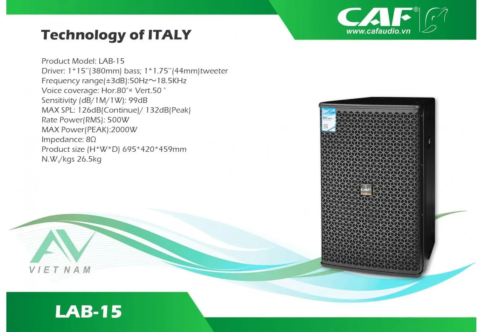 LAB-15 dòng loa cao cấp cho Karaoke chuyên nghiệp của thương hiệu CAF AUDIO với Driver củ loa cao cấp đến từ thương hiệu LAVOCE sẽ đem tới cho quý khách trải nghiệm âm thanh tuyệt vời nhất.