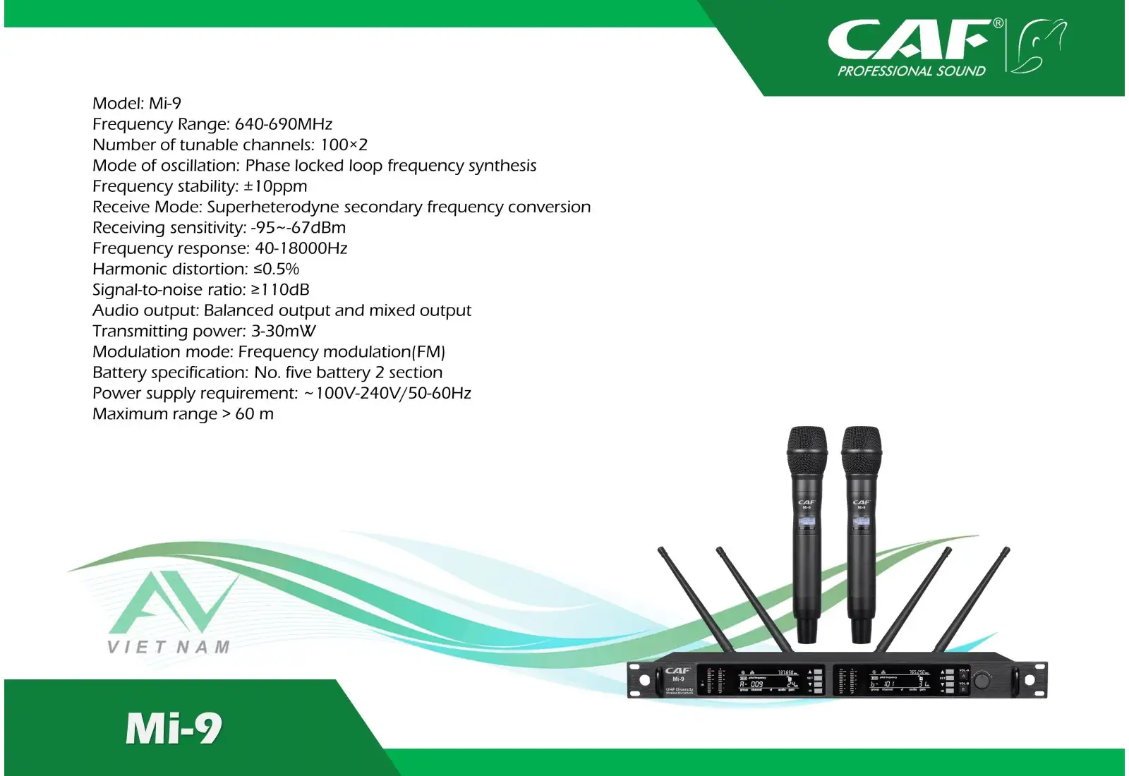 Model: Mi-9 (Pro) Micro không dây dành cho biểu diễn sự kiện chuyên nghiệp chính hãng CAF Audio. Với khả năng thu nhận sóng ở khoảng cách xa lên đến trên 60m và xấp xỉ 100m, micro CAF Mi-9 (Pro) luôn được tin dùng trong các chương trình biểu diễn chuyên nghiệp trong nhà và ngoài trời.